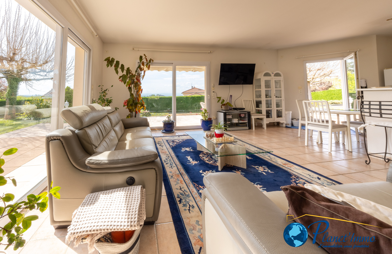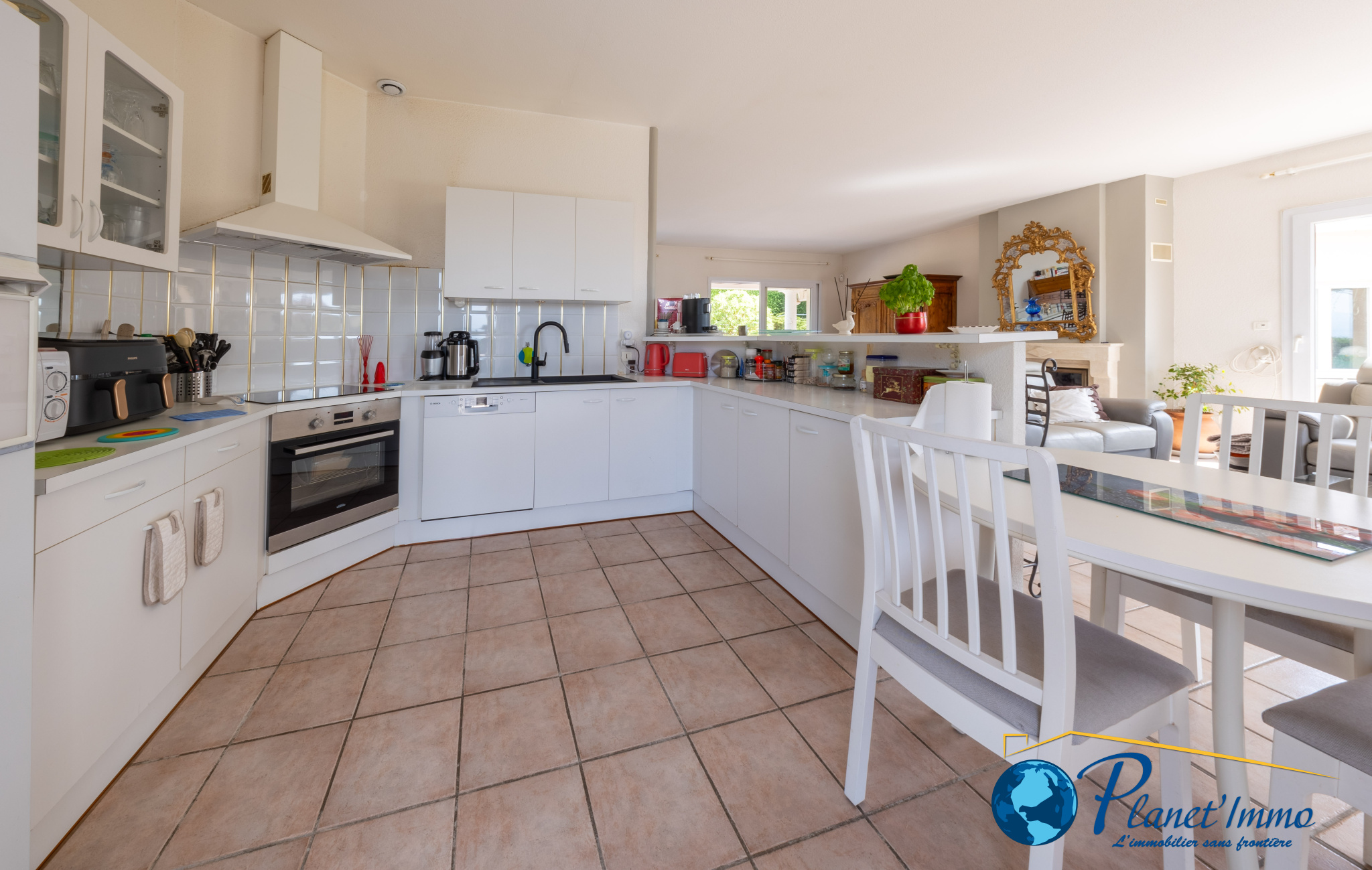 Elle se compose d’un vaste séjour lumineux de 69 m² avec plusieurs accès vers l’extérieur, prolongé par une cuisine aménagée et équipée.