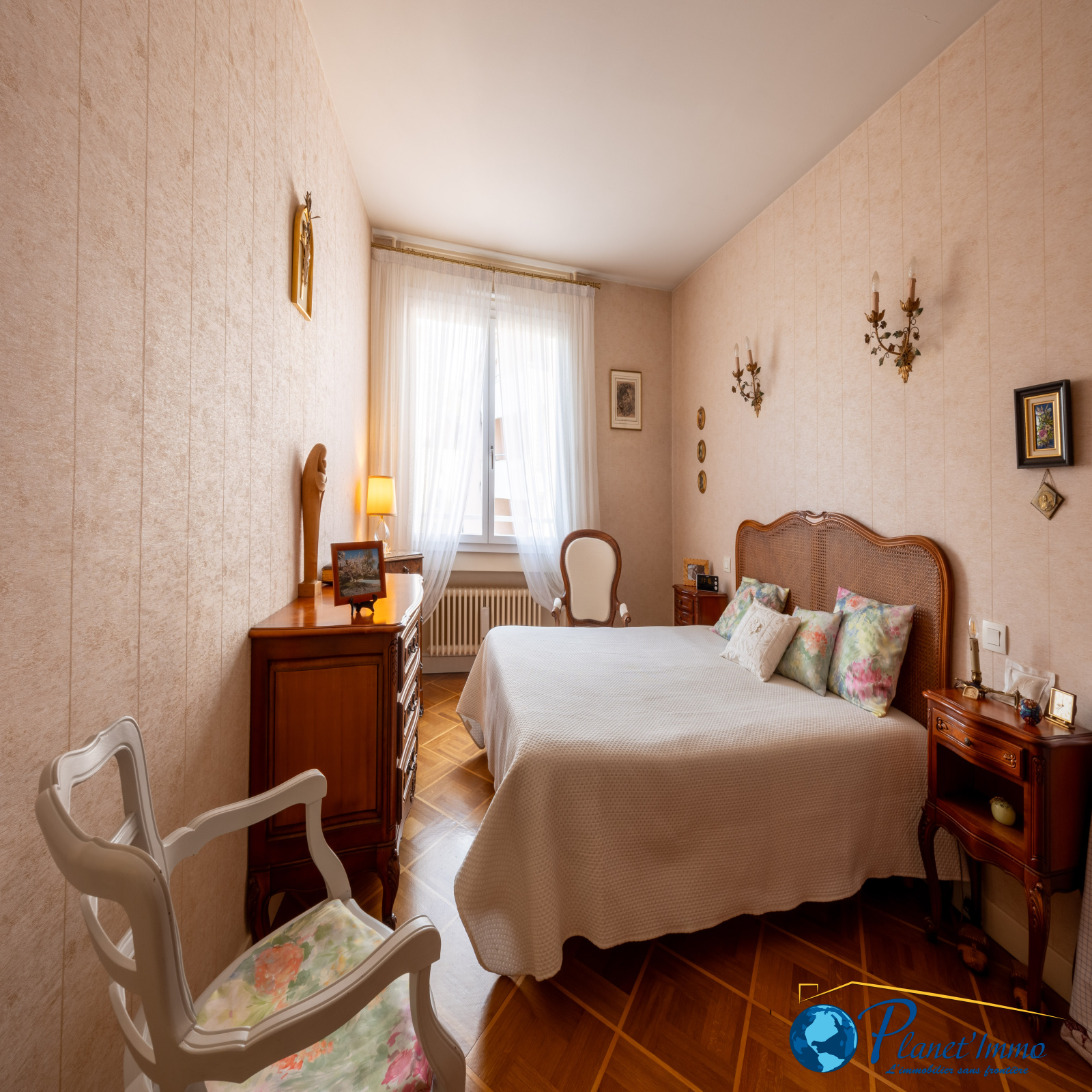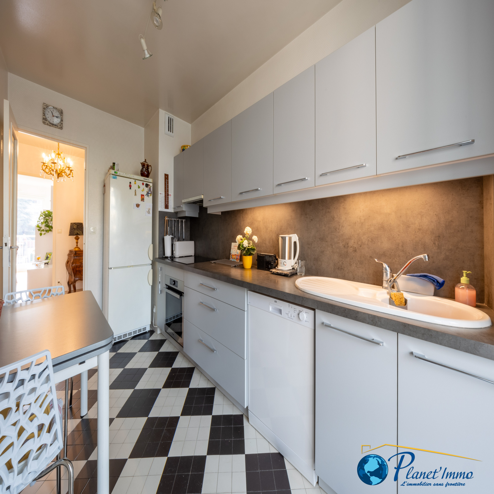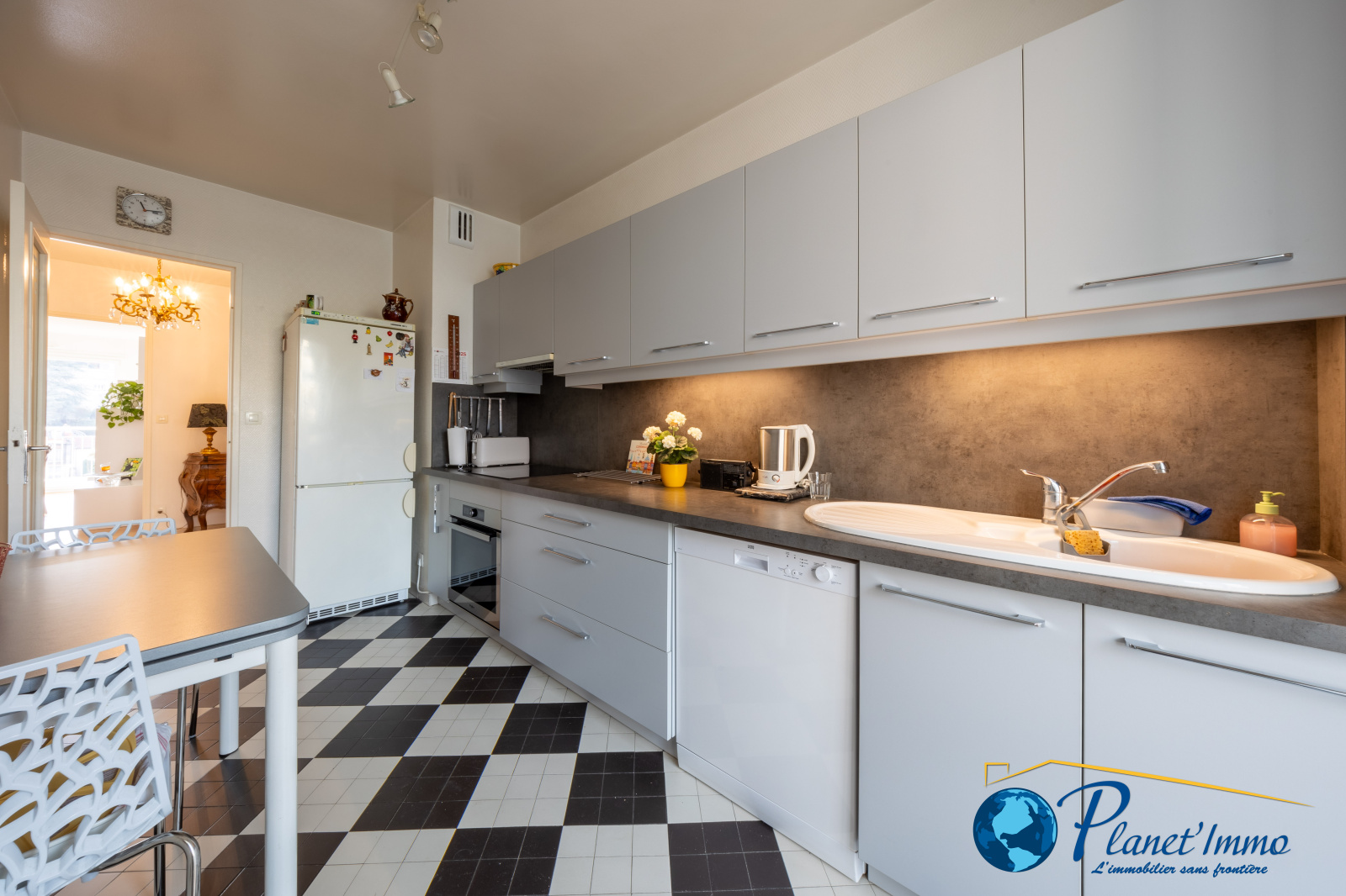 Dans le prolongement, une cuisine indépendante entièrement aménagée avec une loggia et un cellier. Deux belles et grandes chambres. Un espace dressing, une salle d’eau récente, WC séparés, ainsi que de nombreux rangements. Une cave en sous-sol et un garage fermé dans l’immeuble.