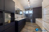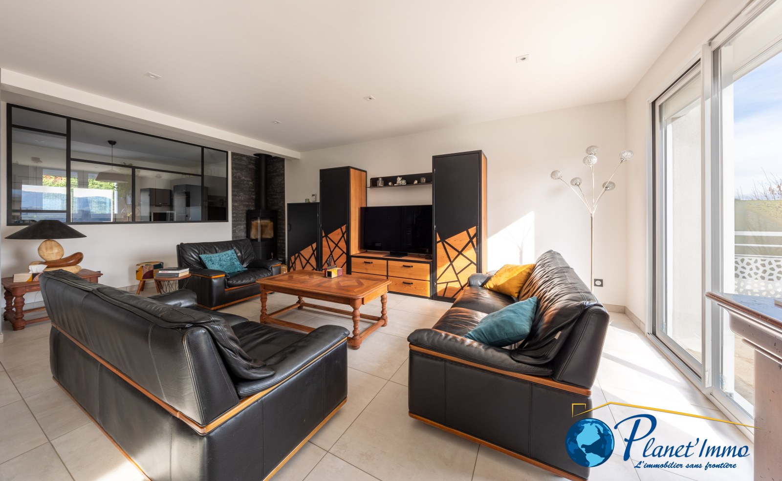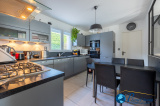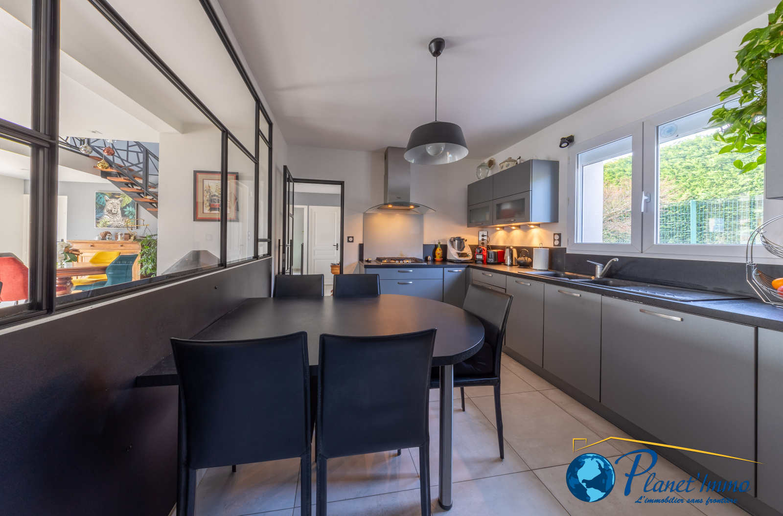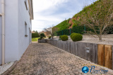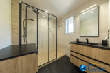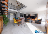 Elle se compose de plain-pied d'un séjour lumineux de 44m², dans son prolongement une cuisine aménagée et équipée de 12m2, un bureau pouvant être aménagé en chambre avec une salle d'eau, une lingerie / cellier et garage double.